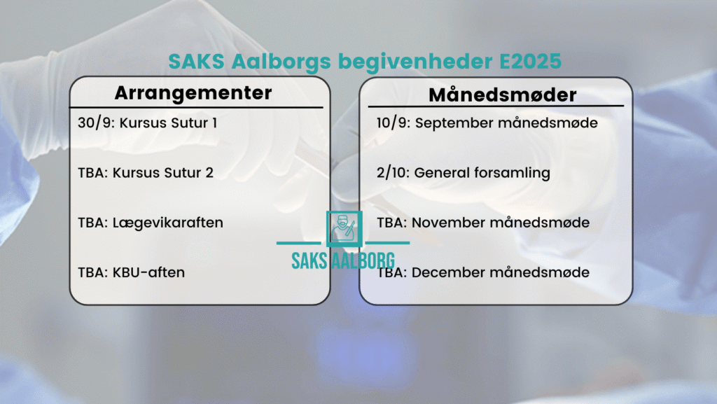 Bestyrelsen for SAKS Aalborg består af en gruppe dedikerede og passionerede medicin studerende, der arbejder hårdt for at skabe interessante og informative arrangementer og aktiviteter for medlemmerne. Dette inkluderer foredrag og workshops med erfarne kirurger, praktisk træning i kirurgiske teknikker.